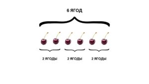 У нас есть 6 ягод. Мы делим их на 3 одинаковые части. В каждой части получится по 2 ягоды. Мы можем провести обратную операцию – умножения. 2 ягоды умножим на 3 и получим 6. В числе 6 помещается только 3 раза по 2. Поэтому, если мы разделим 6 на 3, получим 2.