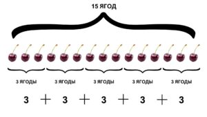 Проще говоря, умножение – это повторение (сумма) одного и того же числа (множимого) определённое количество раз. В нашем случае, это число 3. Мы повторяем его 5 раз подряд. Рассмотрим на примере ягод: